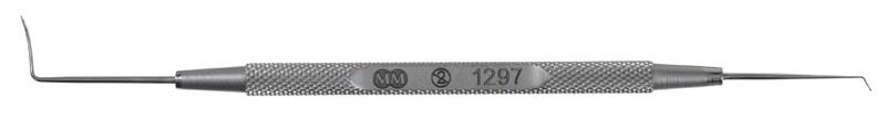 Крючок для создания ламелярного кармана 0,22 × 2 мм, кончик лопатки 1,2 × 2 мм, изогнутый сепаратор под углом к стержню 90°, рукоять 52 мм