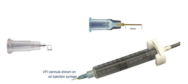 Канюли VFI специально предназначены для введения силиконового масла «hands-free» через троакар при выполнении операций 23 и 25g, при этом силикон вводится в 2 раза быстрее, чем при использовании обычных канюль. Просто установите канюлю VFI в порт троакара и вводите силиконовое масло или БСС. Идеальна для обмена PFO на масло. Не совместима с троакаром Алкон.